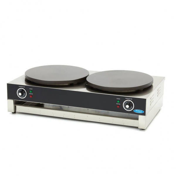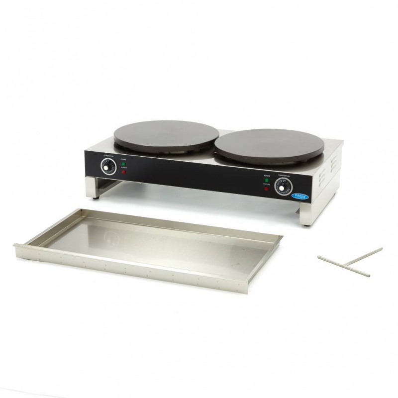 Električni pekač palačink s premerom 2 x 40cm. Palačinkar je izdelan in najkvalitetnejših materialov, kar zagotavlja dolgo življensko dobo aparata in varno uporabo. Delovna temperatura 50 ~ 300°C .Moč grelca 2 x 3000W. Opremljen s predalom za odlaganje pribora.