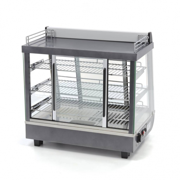 Profesionalna vitrina za shranjevanje toplih sendvičev, predjedi in prigrizkov. Steklena vrata spredaj in zadaj. Temperatura nastavljiva 30-90 C. Širina vitrine 675mm.