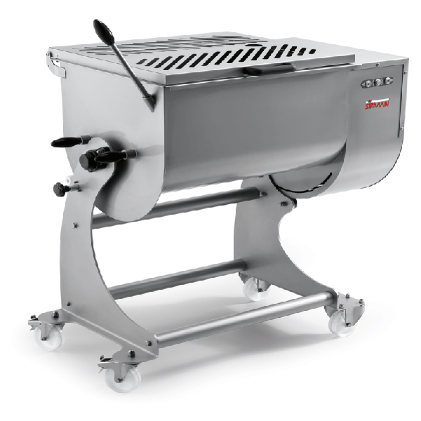 Profesionalni mešalec za meso, priznane italijanske blagovne znamke. Mešalec je namenjen mešanju večje količine mesa za klobase, salame, mase za čevapčiče ipd. Opremljen je z dvema mešaloma, katera se pri čiščenju lahko odstranita. Mešala mešata v obe smeri, posoda se pri praznjenju mase nagne do 90 °. Zaradi večje varnosti je mešalec opremljen še z mikro stikalom, zaščitnim pokrovom in 24V krmiljenjem.