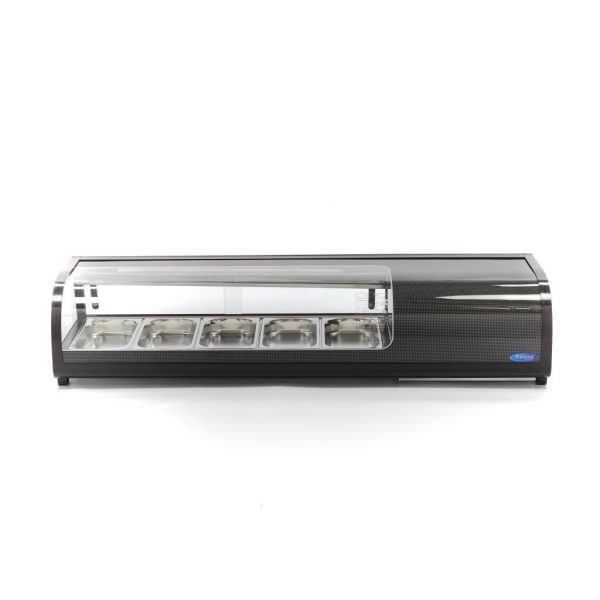 Luksuzna hladilna vitrina z ukrivljenim steklom in držali za posode GN iz nerjavečega jekla.