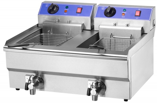 Električna friteza volumna 2 x 16 lit. Ohišje in košara sta izdelana iz nerjaveče pločevine. Friteza je opremljena s termo ročajem, odtočno pipo in termostatom.