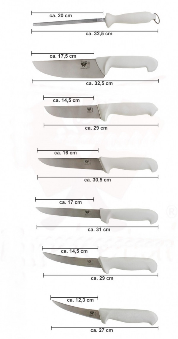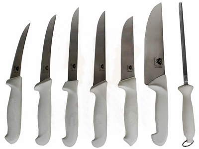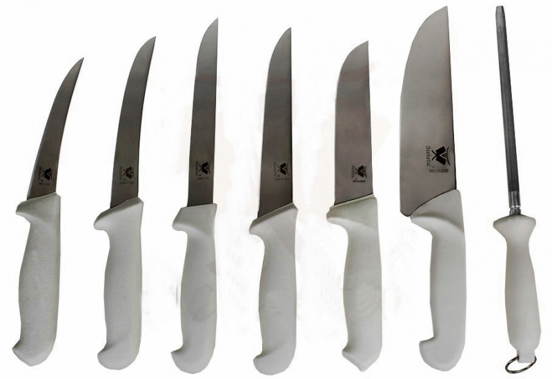 Garnitura nožev za uporabo v mesnicah, gostinskih obratih in v gospodinjstvu. Noži so ergonomnsko oblikovani,kar omogoča varno in neutrudljivo uporabo.Rezila inox (420 J 2 ).