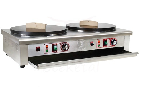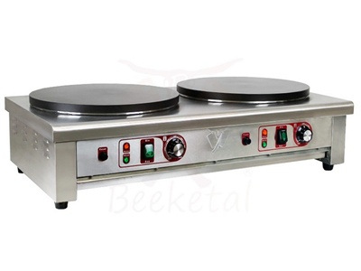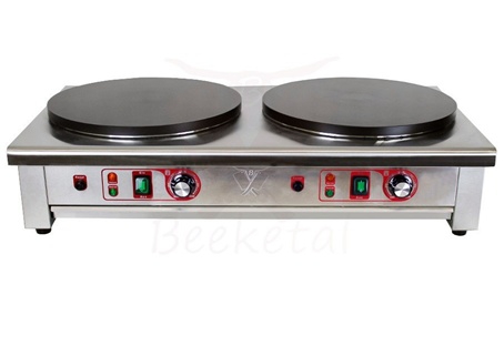 Električni pekač palačink  s premerom 2 x 40cm. Palačinkar je izdelan in najkvalitetnejših materialov, kar zagotavlja dolgo življensko dobo aparata in varno uporabo. Delovna temperatura 50 ~ 300°C .Moč grelca 2 x 3000W. Opremljen s predalom za odlaganje pribora.