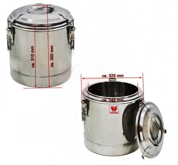 Termo posoda za hrambo in prevoz jedi. Termos je v celoti izdelan iz nerjaveče pločevine, opremljen z stranskima ročajema in ročajem na pokrovu. Primeren za kuhinje,menze,restavracije, klube...