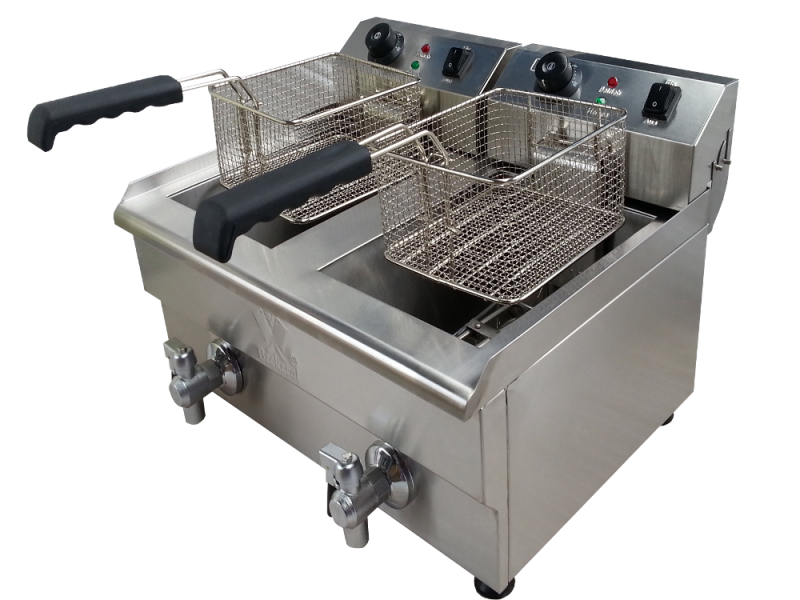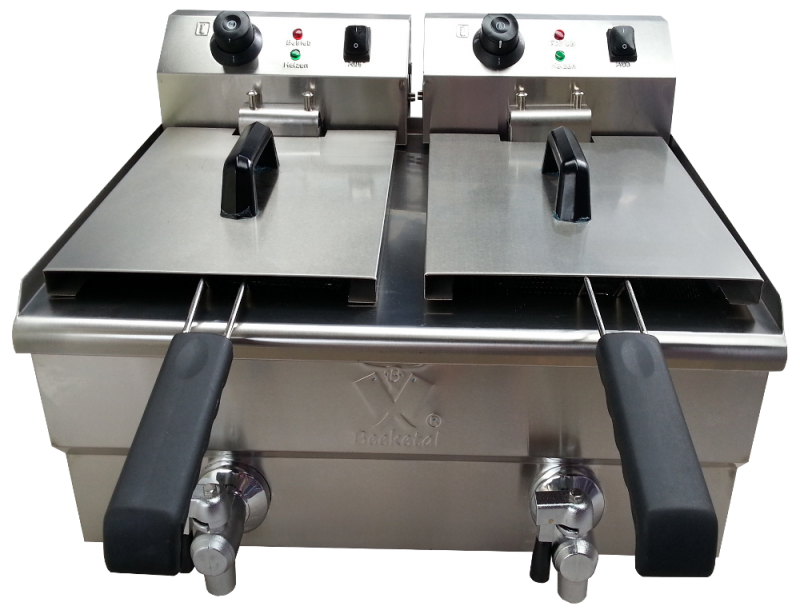 Električna friteza volumna 2 x 10 lit. Ohišje in košara sta izdelana iz nerjaveče pločevine. Friteza je opremljena s termo ročajem, odtočno pipo in termostatom.