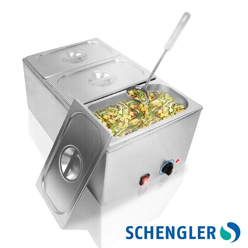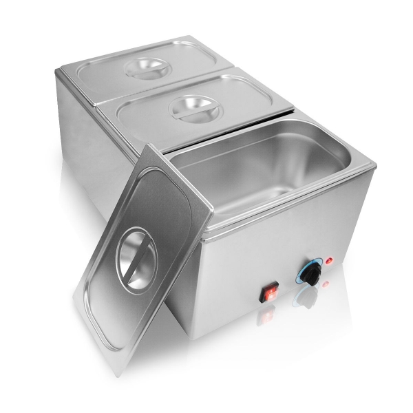 Material nerjaveče jeklo INOX Vložek 3 x GN 1/3 (150 mm) Dodatni varnostni termostat Temperatura max 90 ° Napajanje 230 V / 50 Hz Poraba moči 1200 W Dimenzije 540 x 340 x 250 mm Teža 11,5 kg