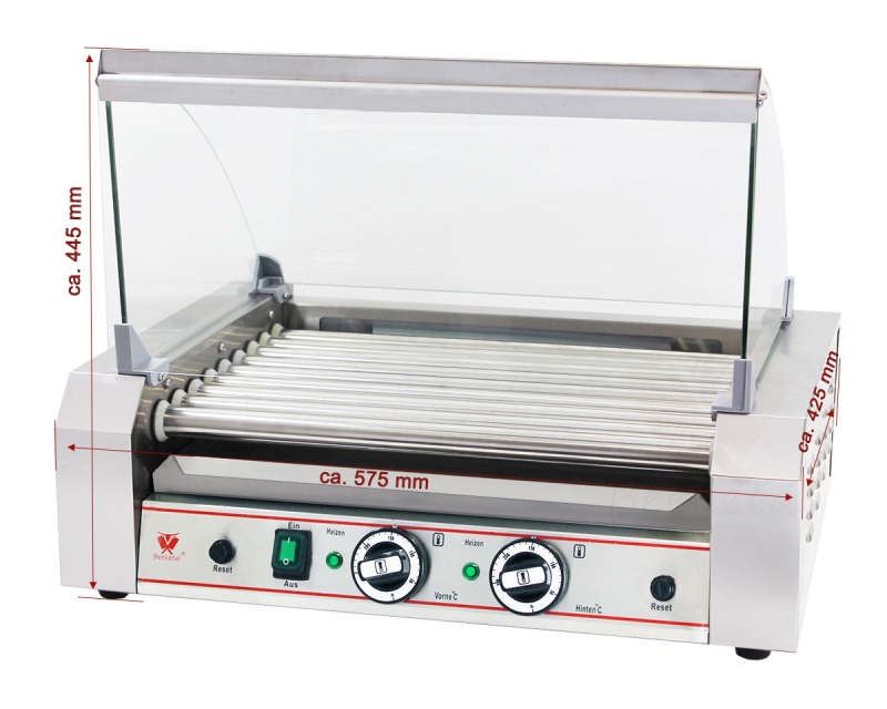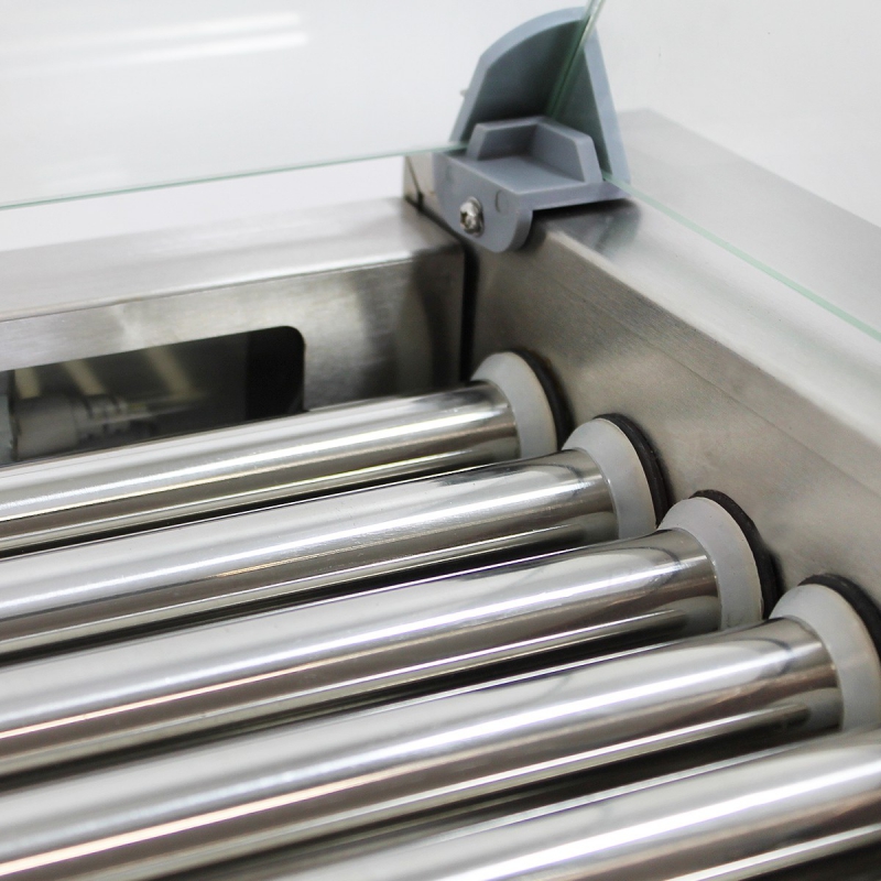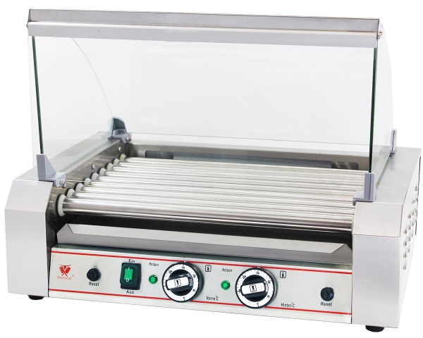 Hot dog roller za pečenje hrenovk s pomočjo vrtečih se valjev. Moderna zasnova se prilega vsakemu ambientu. Ohišje in grelni valjčki so iz nerjavečega inox materiala. Hot dog aparat je opremljen še s predalom za odtekanje maščobe in stekleno zaščitno vitrino.