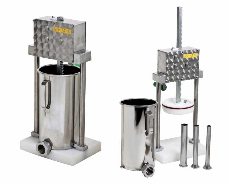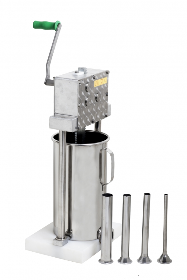 Polnilka za polnjenje klobas in salam, s kapaciteto polnjenja 13 litrov.Polnilka je v celoti izdelana iz visoko kavostnega nerjavečega jekla. Zelo robustne izdelave. Dvojno zobniško razmerje omogoča dve hitrost in sicer; počasno polnjenje salam ter hitro izvleko potisnega bata. Bat je opremljen z silikonskim tesnilom in odzračevalnim ventilom. Kompletu so dodani 4 tulci. Polnilka je primerna za vse vrste klobas.