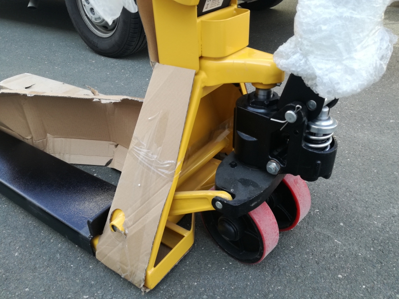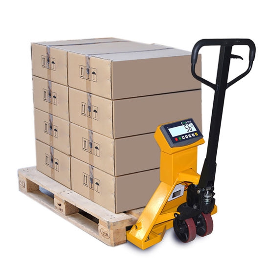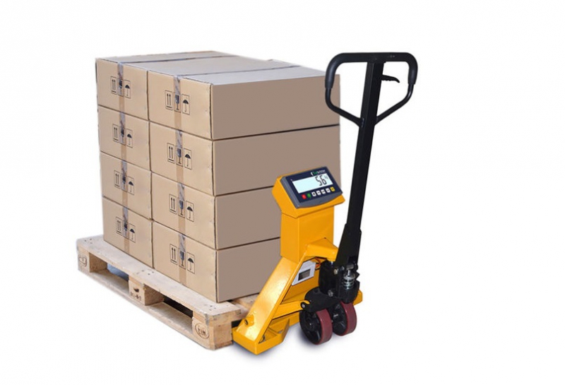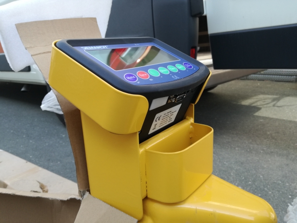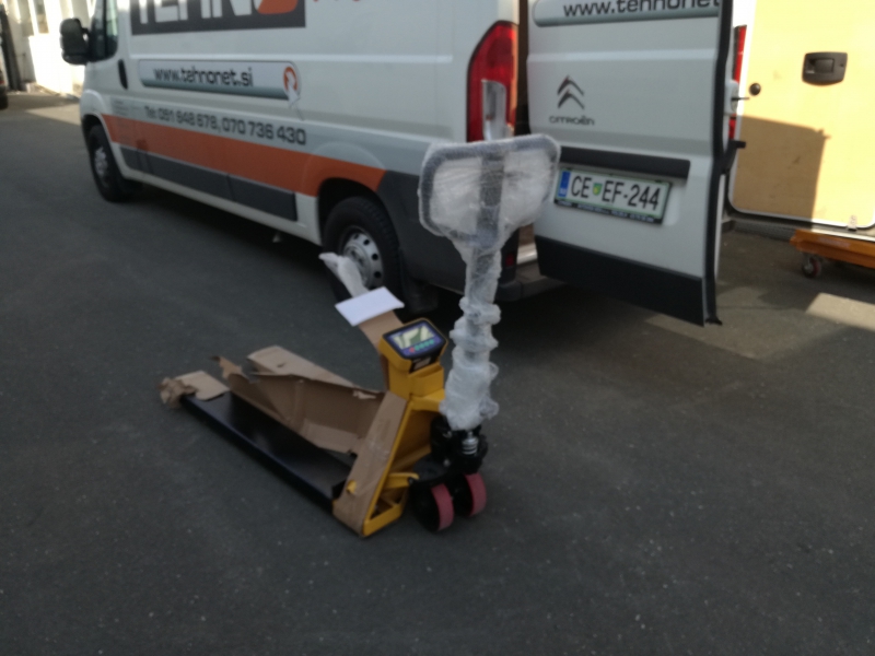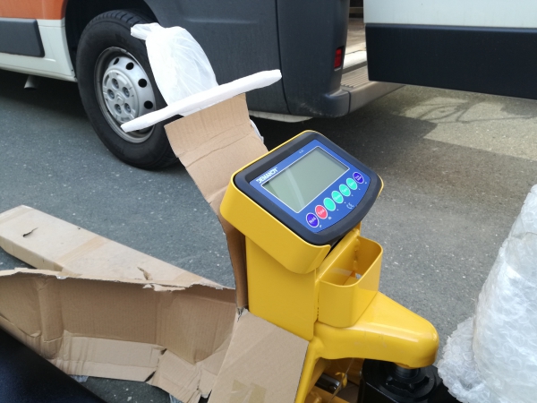 Paletni viličar s tehtnico 2000 kg. Tehtanje bremena je mogoče tudi med samim premikom.