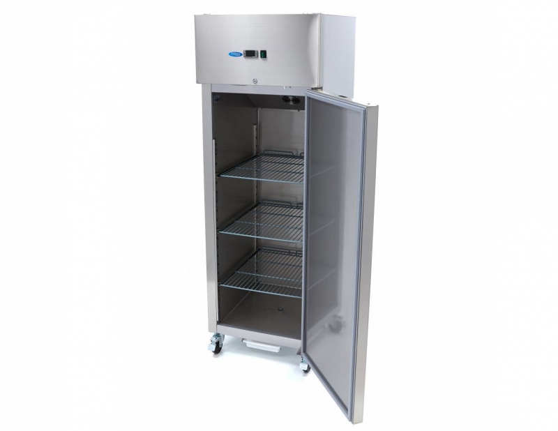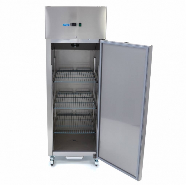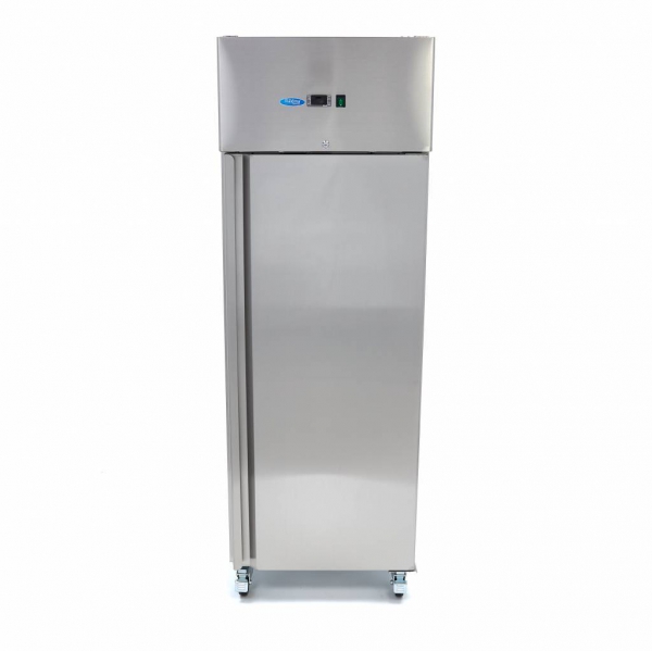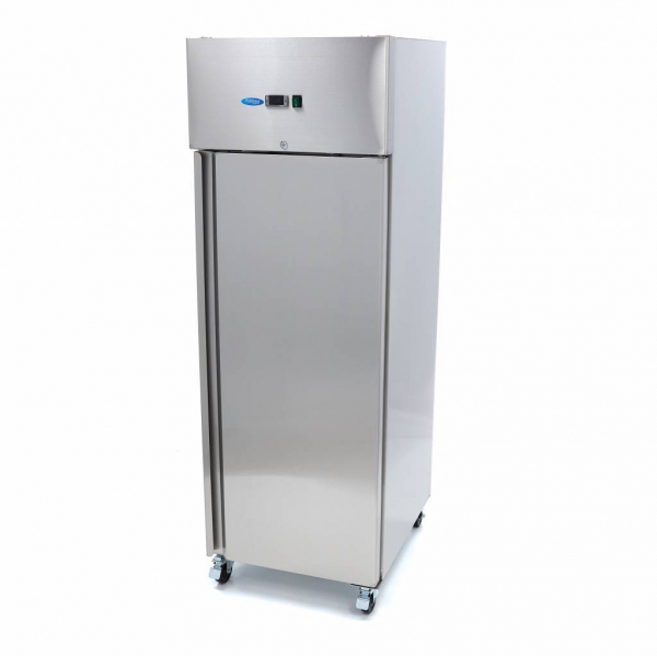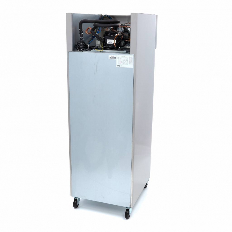 Luksuzni hladilnik 600 litrov - 2/1 GN - z inox ohišjem in notranjostjo AISI 304, ključavnico in tremi nastavljivimi policami. Digitalna regulacija temperature in LED luči. Hladilnik je mobilen s štirimi kolesi.